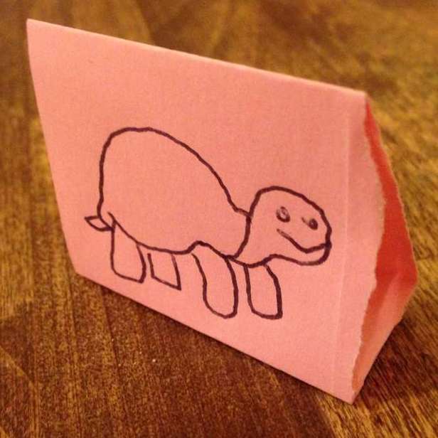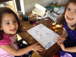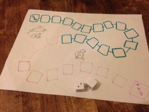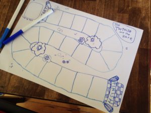 But it did get me wanting to design a game with my two daughters. So I pitched that we spend an afternoon or two doing exactly that, and they were game for it. Days before I had told them the story of the Tortoise and the Hare, and it seemed a good starting point: the race provided a linear A to B structure that would fit in with their other homework boardgame designs. So we chatted about how the tortoise moved, and how the hare moved. They liked rolling dice, so it seemed fitting to do that. I first showed them different types of dice, and how a d4 has a different movement than a d12. We tried a couple of tests with these, but it just meant the hare pretty much always won. Next I showed them some blank dice, and we decided to use those. Because you can draw on them.