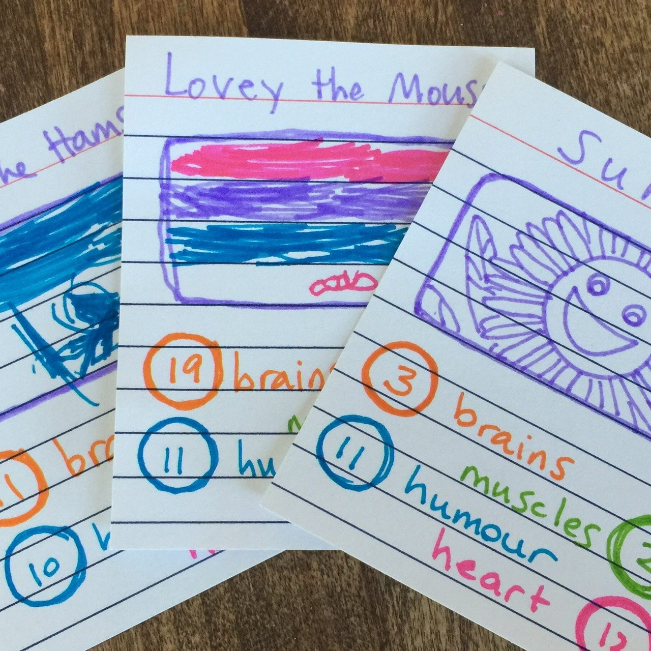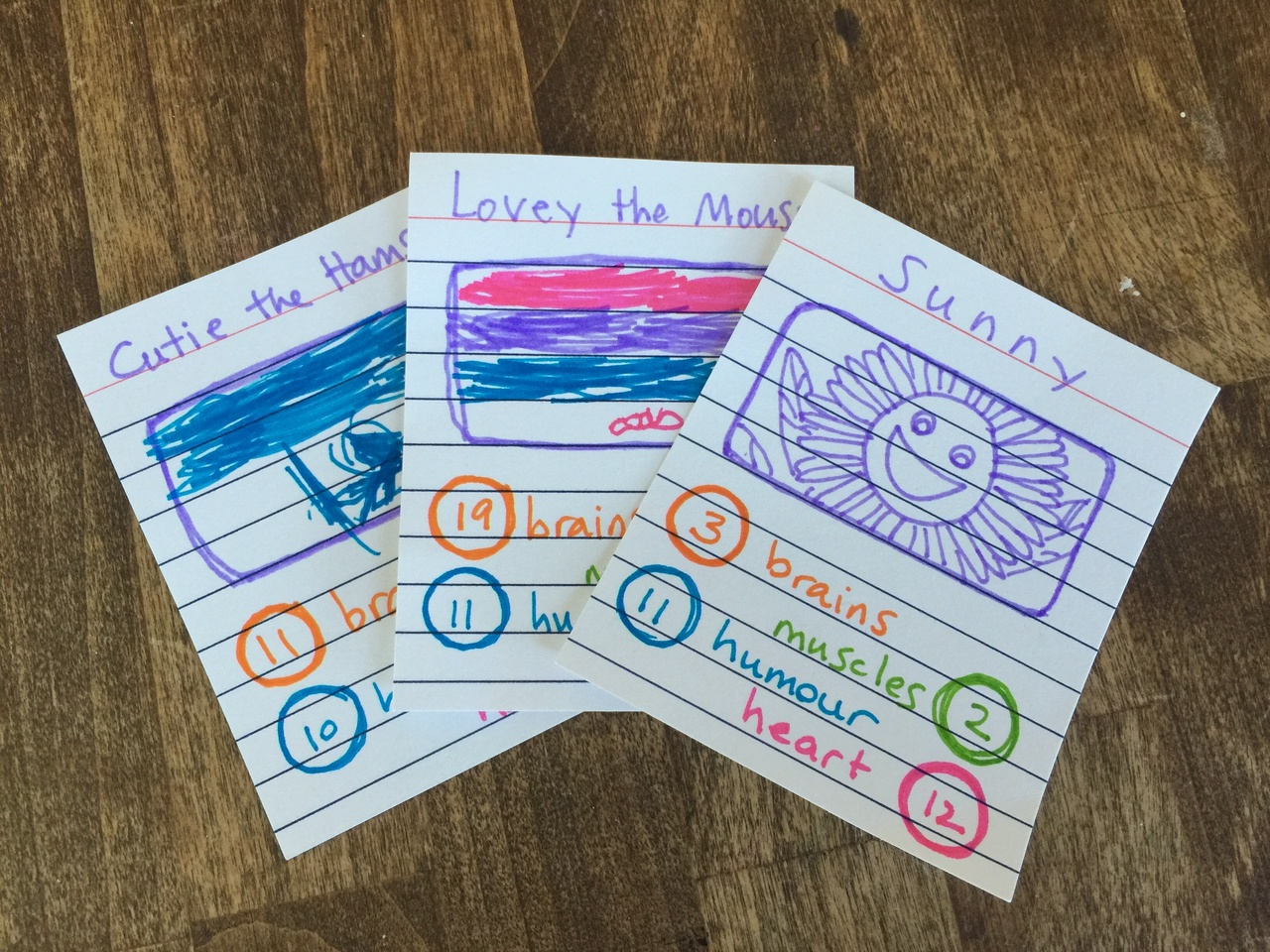 The girls decided on brains, muscles, humour, and heart. From there they drew the characters, and if needed gave them names. It was interesting to see Q start with established characters: Doc McStuffins, etc; and W went with real people: Mom, Nani. But pretty soon they both started making characters up. The next step was to get them to give each character numbers for the attributes. This was initially a challenge, as they both wanted to max out each character. We worked on comparisons — is “Dog” funnier than “Poppy the Pillbug”? This worked, but it was a bit odd with the real-person cards. With W's “Mom” card — which is clearly the “top trump” — W asked if she needed to stick to the 1-20 range for “heart”, or if she could go higher, “like a million or something”. It was very, very sweet.